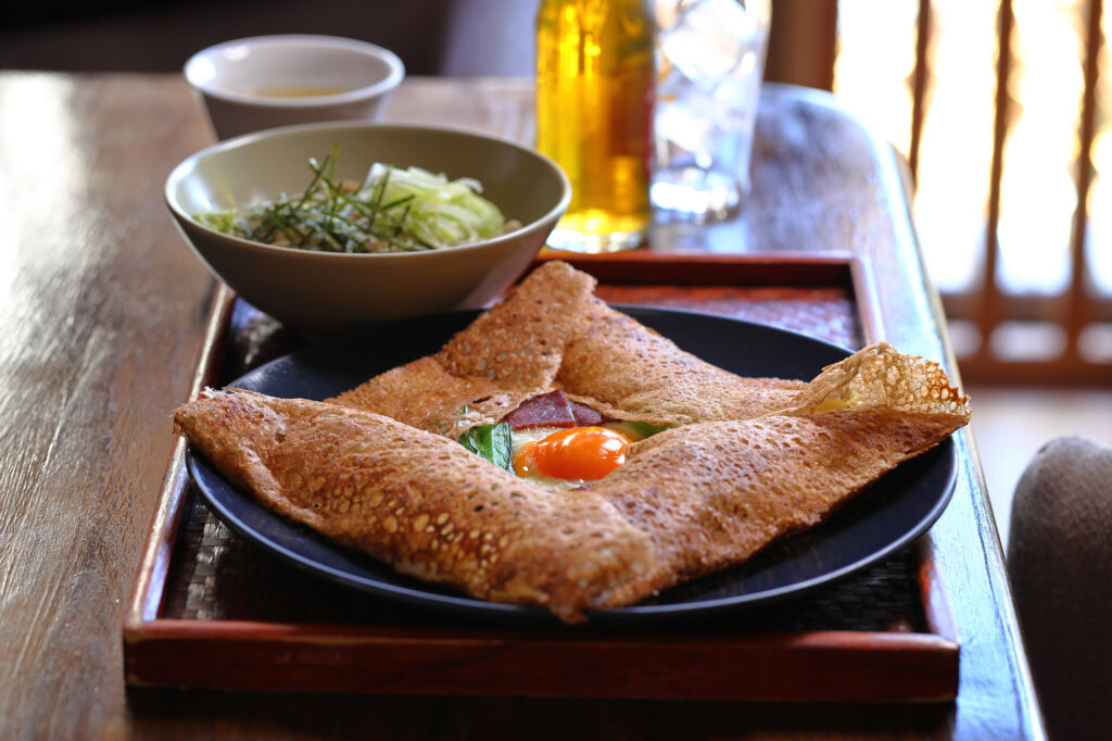 民家を改装したノスタルジックな空間では、信州戸隠のそば粉を使用した瑞々しい蕎麦を味わうことができます。宮城県産の鴨南蛮や季節野菜の天ぷらなど、地元の食材を活かしたメニューの数々。また、本場フランスの作り方で焼き上げられた、そば粉のガレットを提供しています。スイーツのガレットやコーヒーなど、カフェタイムを楽しむこともできるメニューには、「幅広い世代がたのしめるお店でありたい」というオーナーの思いがあります。
